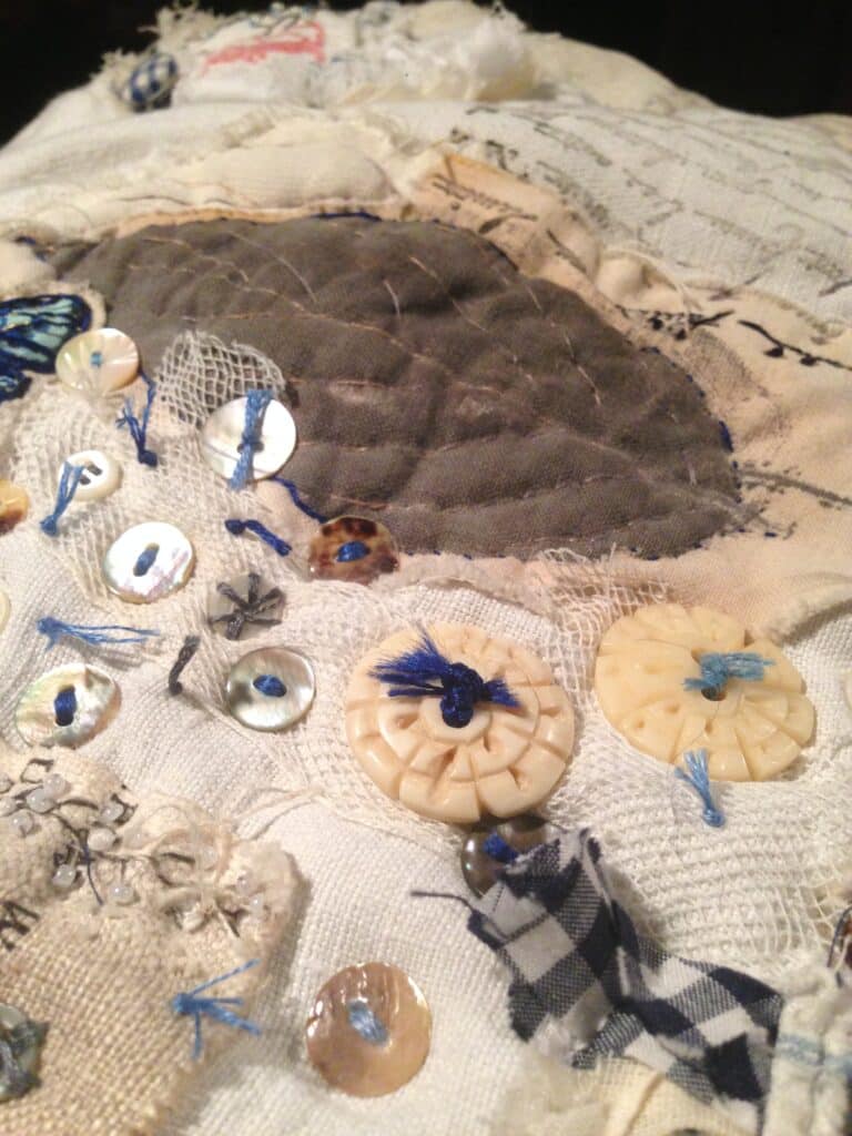 À partir de cette base, l’ouvrage se densifie par l’ajout d’éléments : fils, rubans, tissus, crochet ou même tricot viennent enrichir la composition.