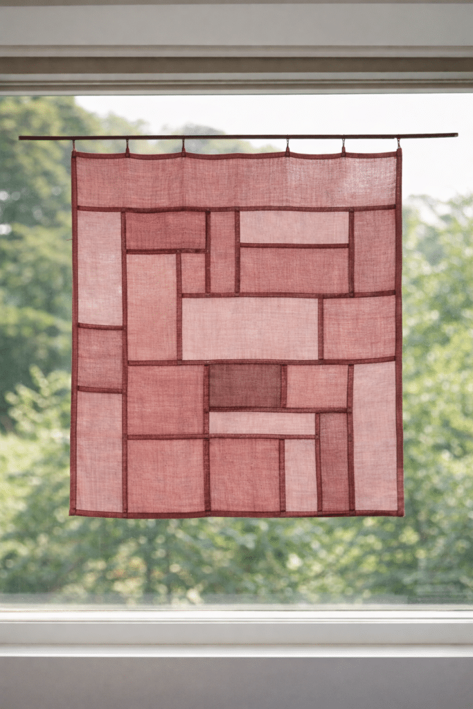 Les tissus sont choisis pour leurs nuances et leurs transparences. L’assemblage se construit par lignes et équilibres de surfaces, jusqu’à trouver une composition lisible et respirante.