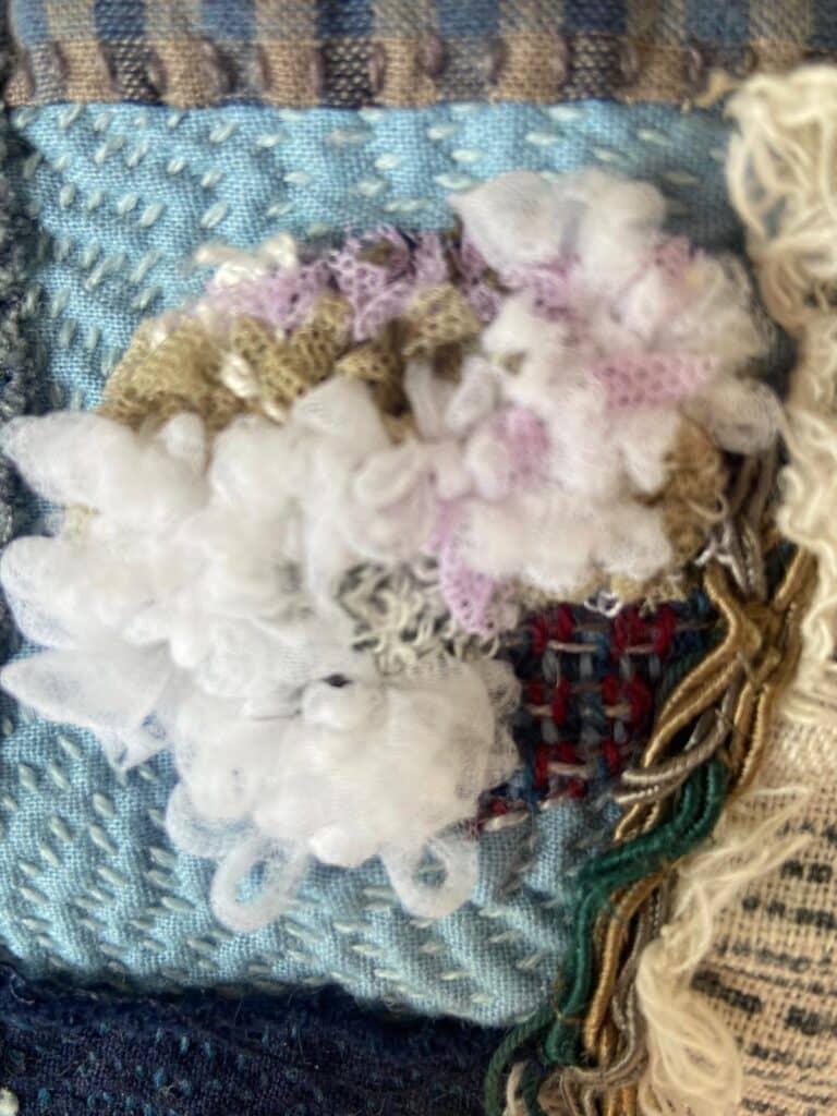 Le crazy se distingue du piécé et du boro par une liberté totale dans l’assemblage. Il n’y a ni grille, ni répétition attendue, ni alignement à respecter. Les pièces sont de formes irrégulières, assemblées les unes aux autres sans chercher la symétrie.